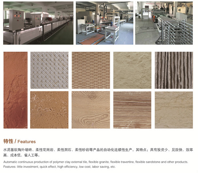 Automatic continuous production of polymer clay external tile, flexible granite, flexible travertine, flexible sandstone and other products. Features: little investment, quick effect, high efficiency, low cost, labor saving, etc.